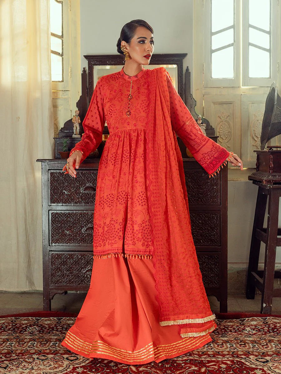 2 Piece Heavenly Designed Orange Embroidered Jacket Paired With Matching Flared Pants