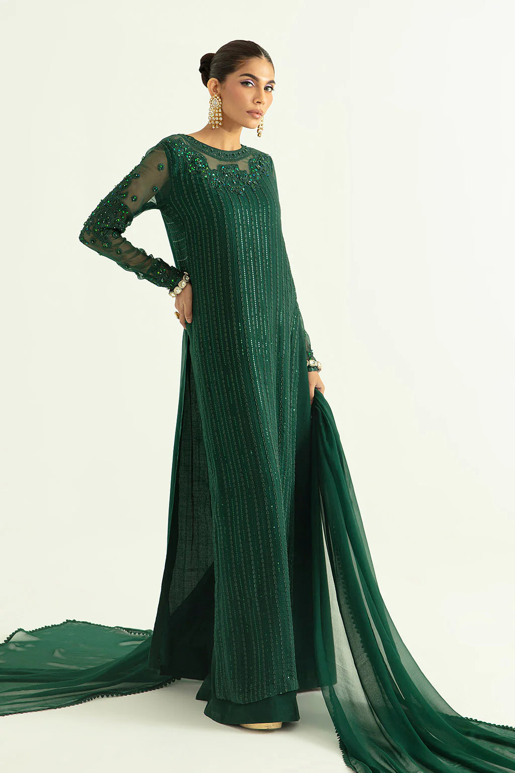 3 Piece Teal Fully Sequins Long Shirt Paired With Matching Raw Silk Palazzo Pants & Duptta